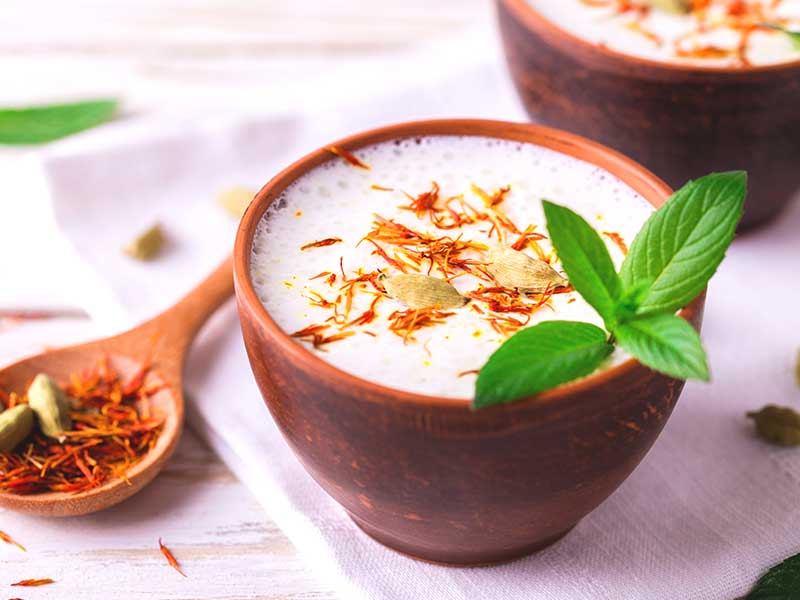 Indian cuisine is famous for its variety and blend of herbs and spices, and it adds dimension, health benefits and interest to lassis, as well. Featured seasonings may include turmeric, an antioxidant and anti-inflammatory; cardamom, a digestive aid; ginger, which can alleviate nausea; and garam masala, a mix of these and other spices including cinnamon, cloves, cumin and bay leaves. Mint is another option, often enjoyed in summer. Due to its distinctive flavor, Dhillon finds that “it is consumed by a very selective community.”