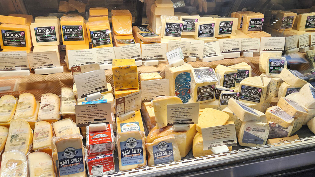 The store offers samples of most of its product, and at any given time, has 80-100 cheeses available, complemented by other local products that pair with cheese.