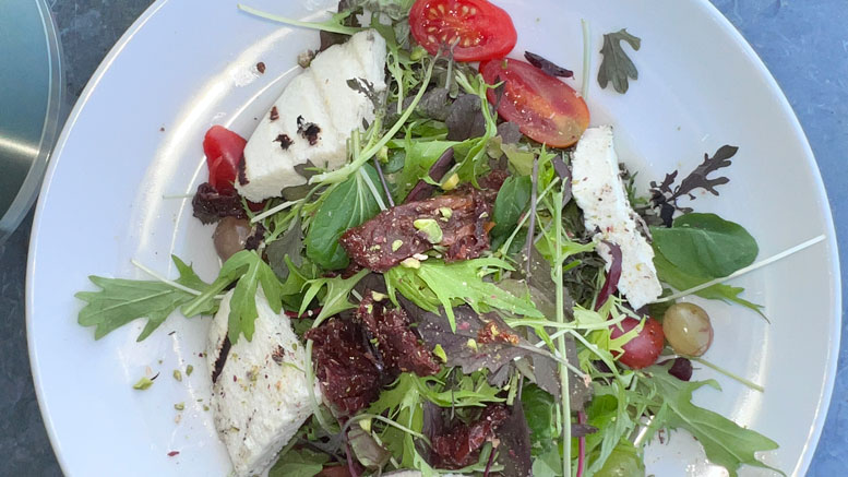 Of the many cheese dishes on the menu, I spotted a salad that featured a grilled variation on a favorite of mine, Manouri or Manoypi, pronounced man-o-yohr-ey in Greek.