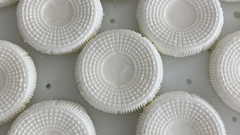 The cheese is then hand-ladled into basket molds to drain. At this point, Sweethardt says, the chèvre begins to take shape. “Instead of having a big, loose curd, it has drained and pulled together as a beautiful cheese.”