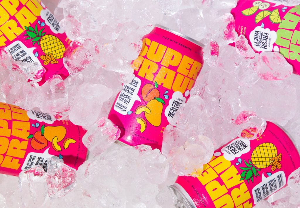With the making of yogurt, there are two or three cups of liquid whey for every cup of yogurt. Yogurt whey is more acidic and cannot be dried and concentrated for the protein, so it’s not usually going toward human consumption. “That’s our liquid gold,” says Melissa Martinelli, a former immigration lawyer turned CEO of Superfrau, a non-alcoholic seltzer maker based in Dorchester, MA. “We capture the liquid whey when it’s super fresh and use it as our main ingredient. In fact, it constitutes 98% of our drink!” Superfrau can be found at Whole Foods and specialty stores throughout New England. Martinelli is hoping for expansion. Flavors include peach mango, pineapple ginger, and cucumber lime. Martinelli’s favorite? “Our cucumber lime over ice, maybe with a splash of Wheyward Spirit.”